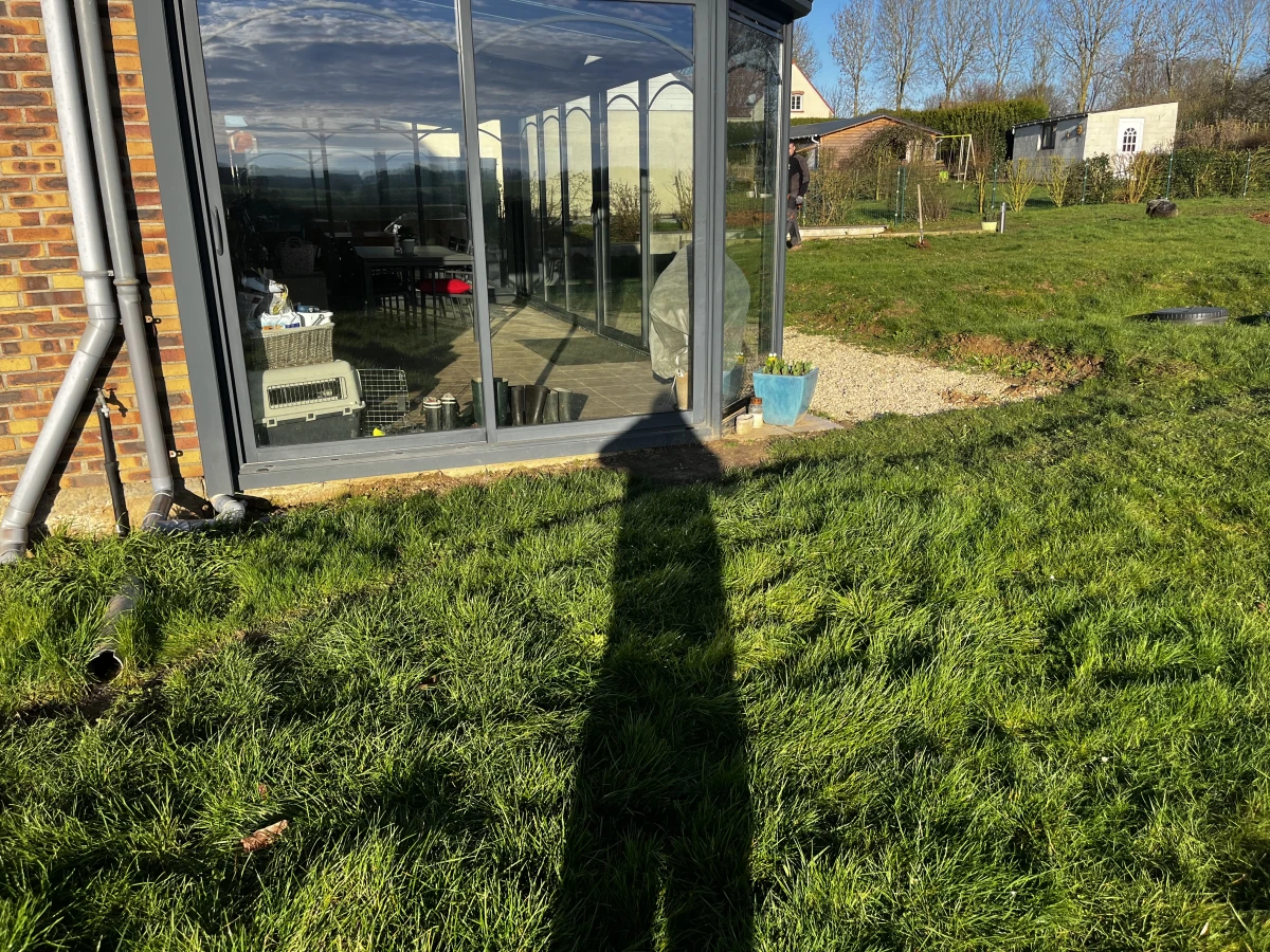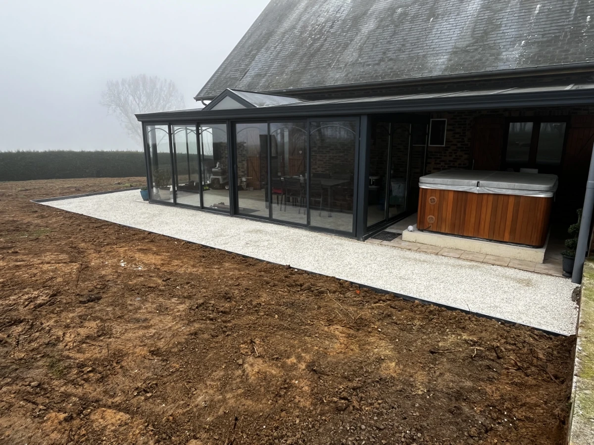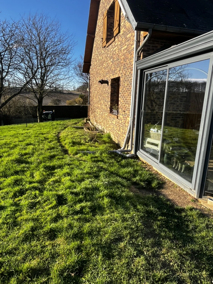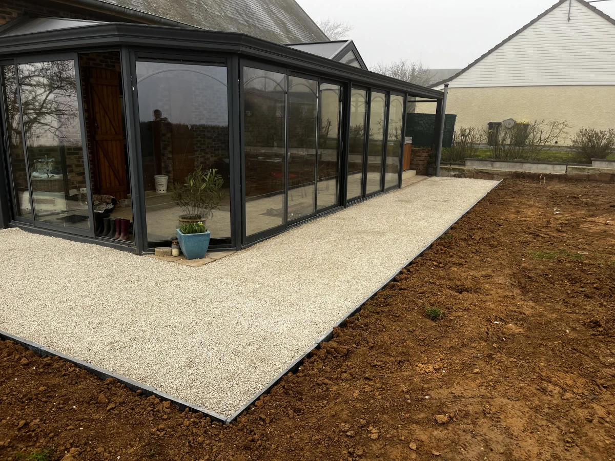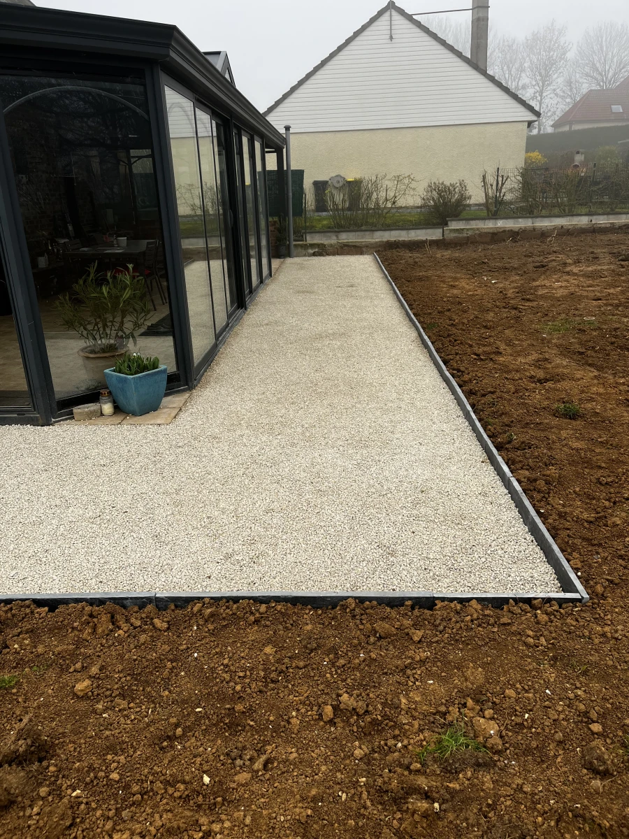 Le sol a été aplanit au maximum afin de préparer une future mise en gazon. Cette étape permet d’obtenir un terrain propre, prêt à être engazonné, pour un rendu final harmonieux et naturel.