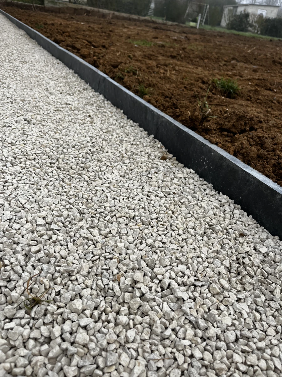 Pour structurer et délimiter le chemin d’accès, des bordures en ardoise naturelle ont été installées. Ces bordures ont été scellées dans du béton, ce qui garantit une excellente résistance et une grande longévité.